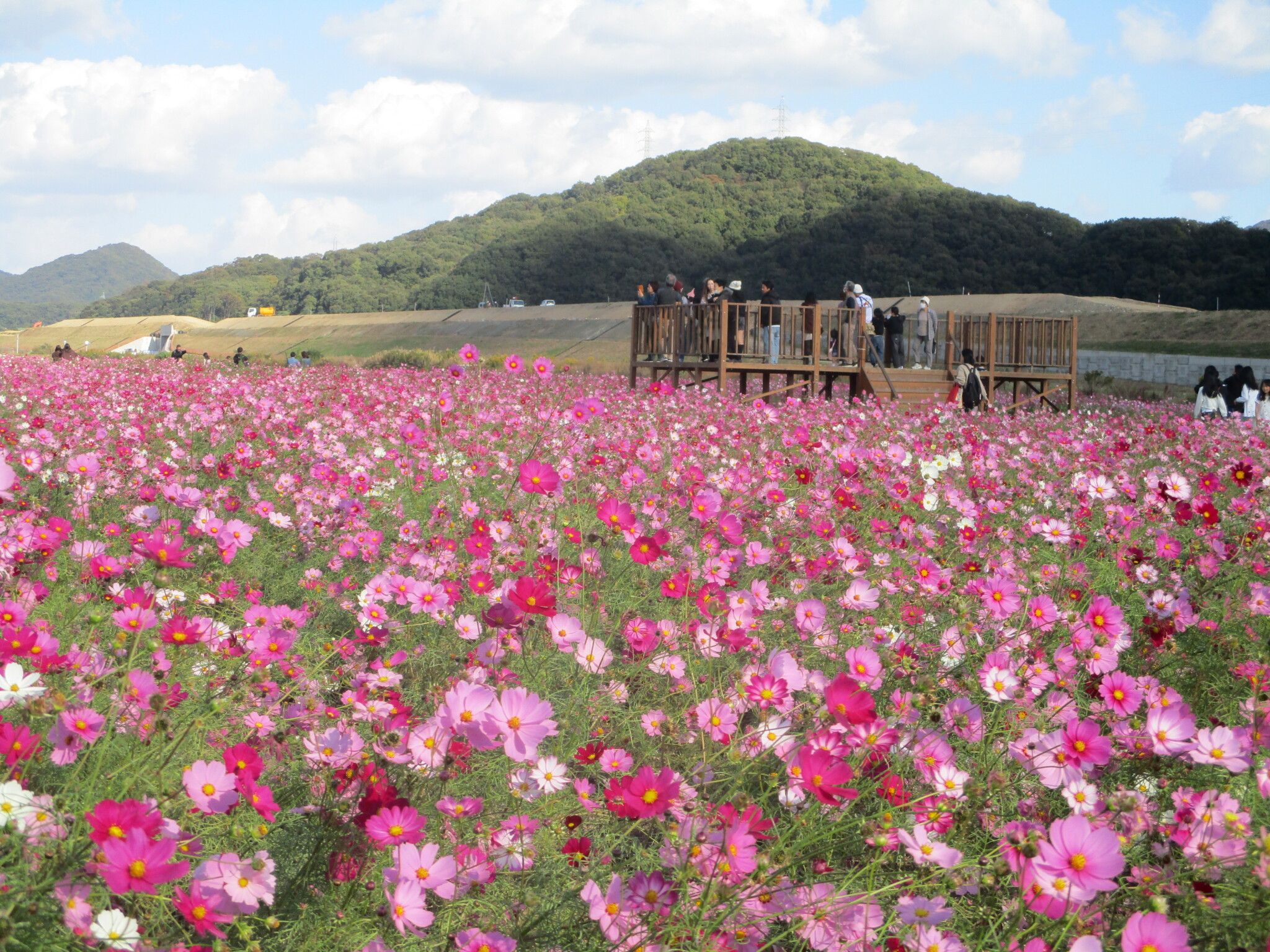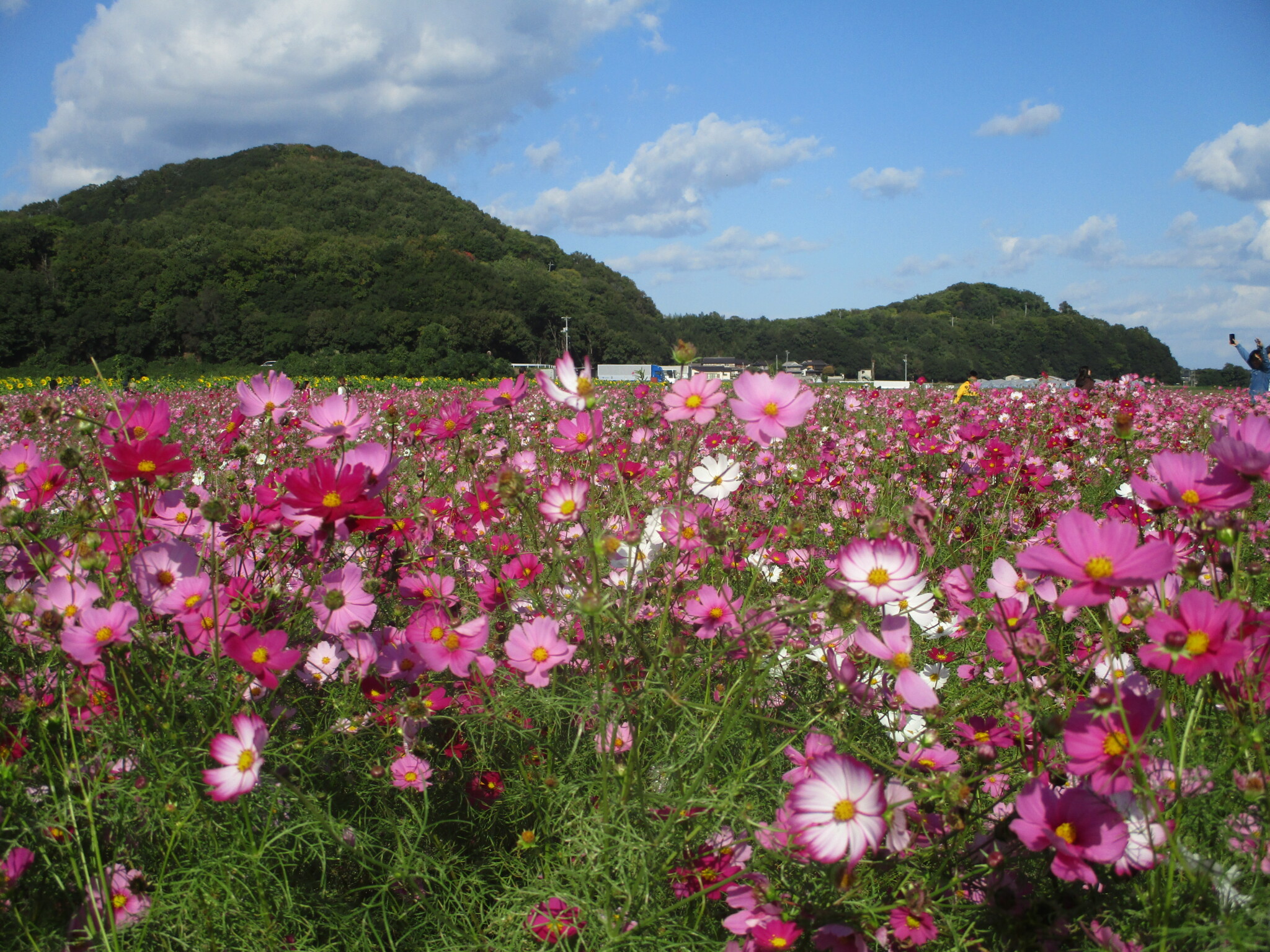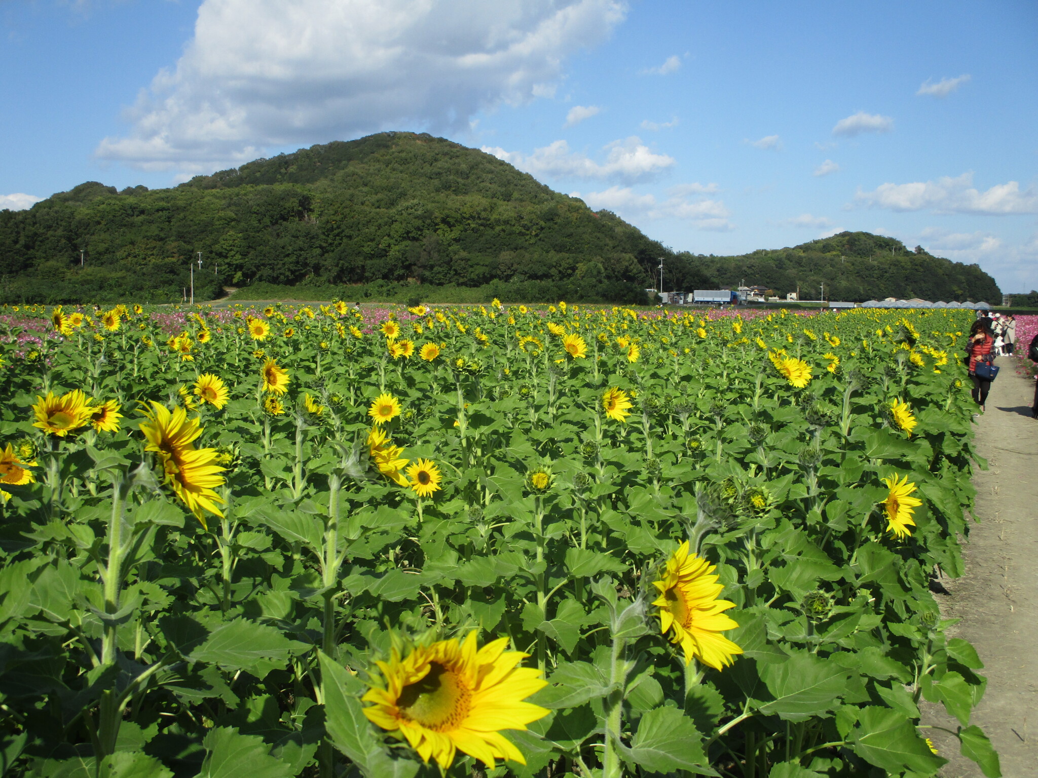 道の駅 笠岡ベイファームではコスモスとヒマワリが見頃を迎えています。多くの観光客で賑わっています。是非、訪れて楽しんで見てください。